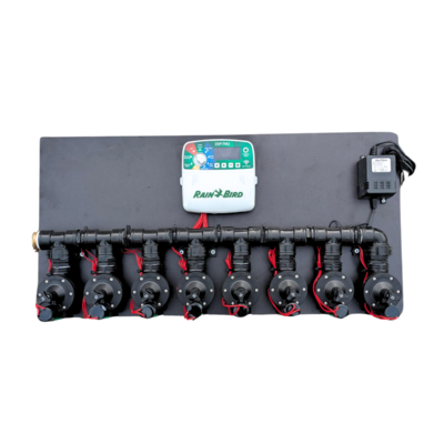 De Rainbird beregeningscomputer ESP-TM2 en de magneetkleppen zijn compleet voorgemonteerd op een berken betonplex plaat van 18 mm dikte. De afmetingen van de plaat zijn 84 x 42 cm.