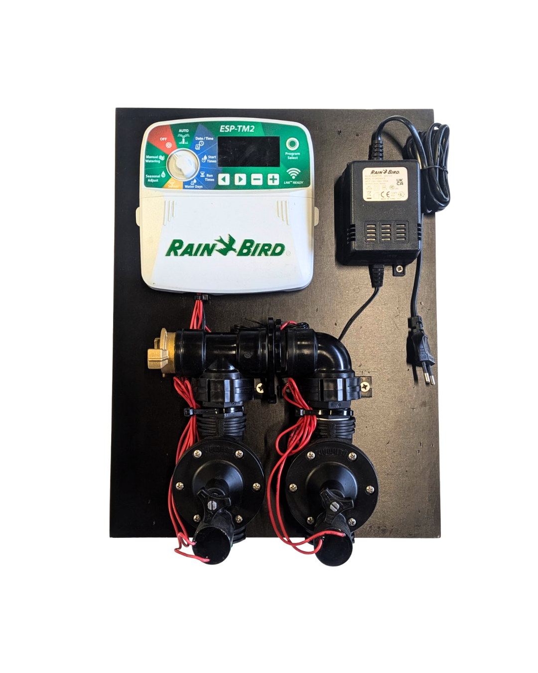 De Rainbird beregeningscomputer ESP-TM2 en de magneetkleppen zijn compleet voorgemonteerd op een berken betonplex plaat van 18 mm dikte. De afmetingen van de plaat zijn 30 x 42 cm.